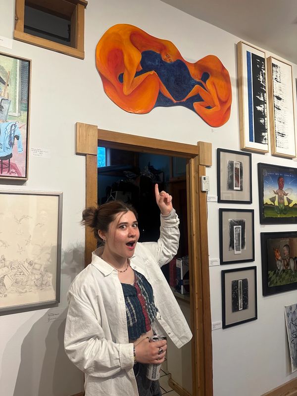 Rachael’s focus is on creating ambiguous, unsettling narratives that invite viewers to create meaning for themselves. She works primarily with oil, acrylic, and flashe paints on alternative surfaces. Wood planks found on the side of the road are intuitively carved into blobs, and bedsheets sourced from friends, second-hand stores, or even her own bed become her canvas.